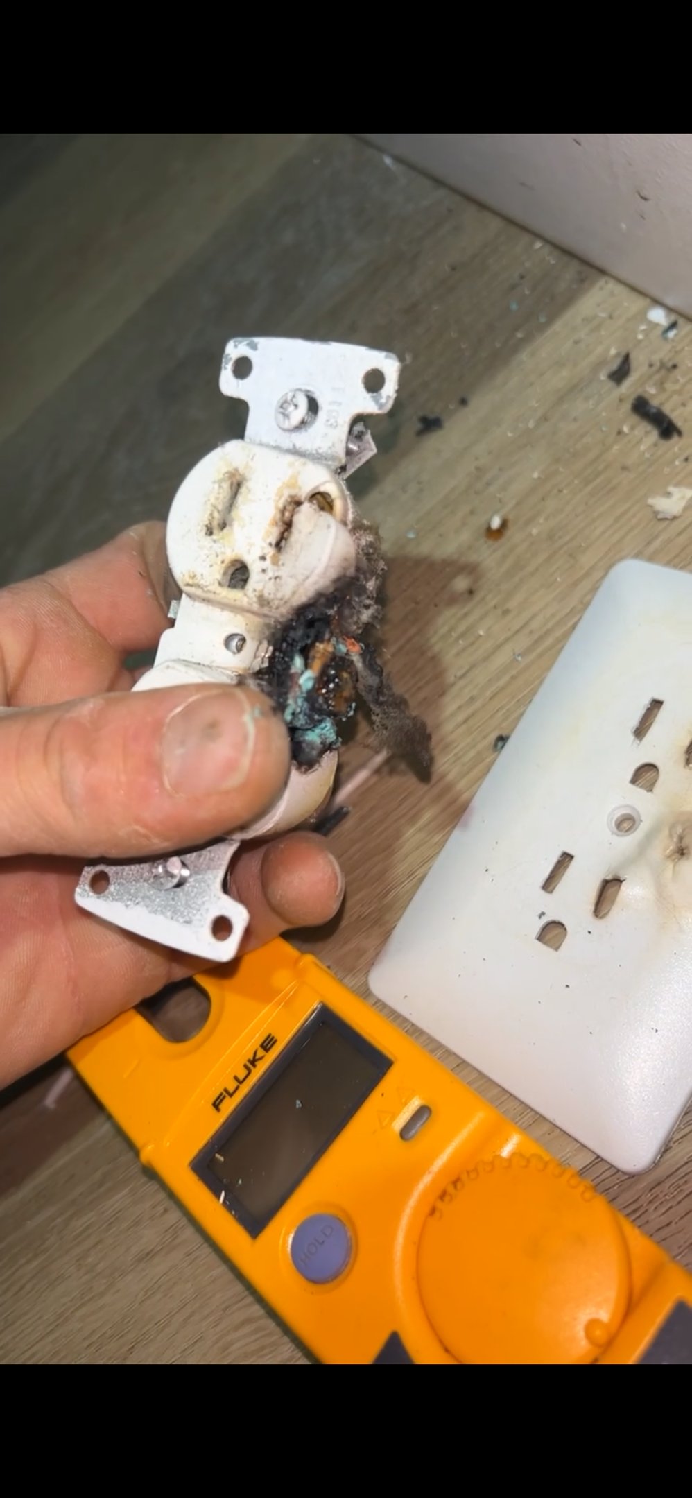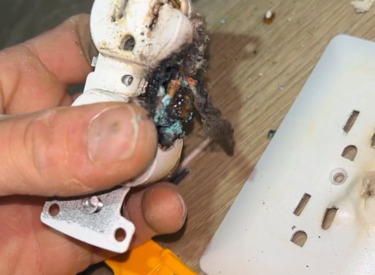 Power was out in two bedrooms, traced the issue to a burned outlet, and safely repaired to restore proper operation.